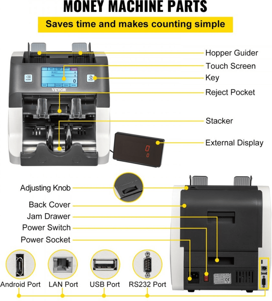 De biljettentelmachine kan worden gebruikt met verschillende elektronische apparatuur vanwege de Android-poort, LAN-poort, USB-poort en RS232-poor